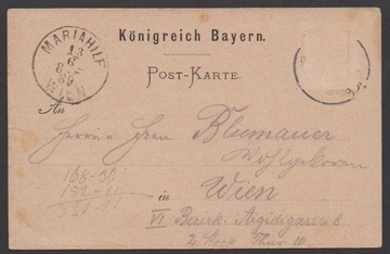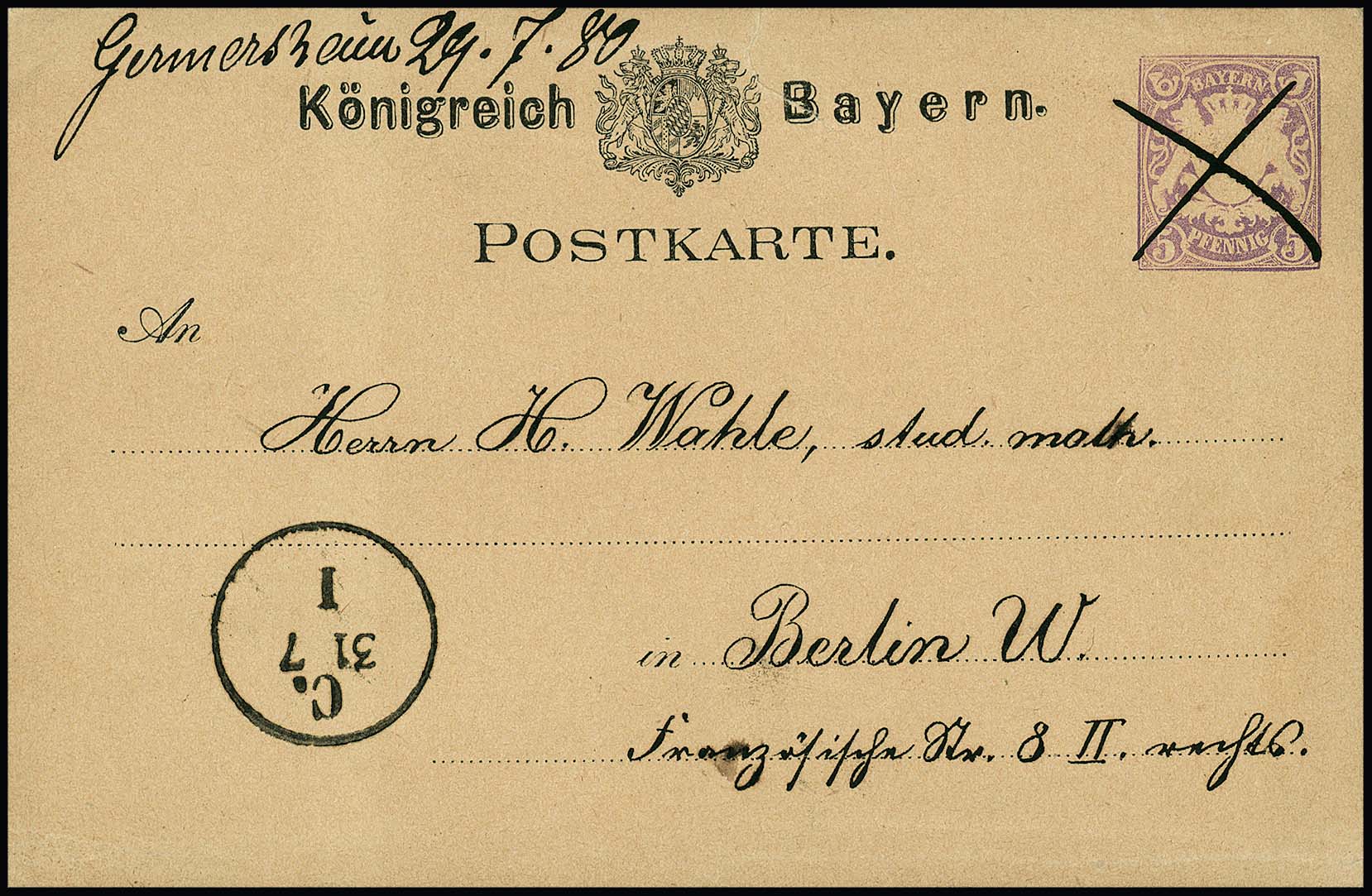 1880-95, vier Ganzsachenkarten 5 Pfg. je mit hs. Entwertungen: Germersheim 1880, Wertingen 1887, Fürsteneck 1892 und Wunsiedel 1895