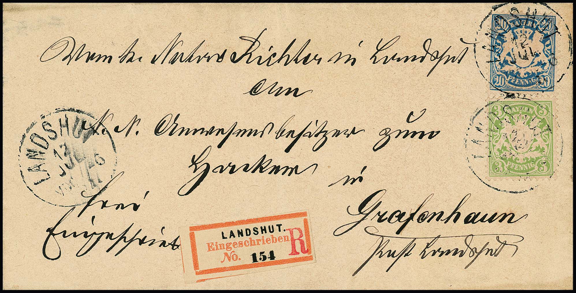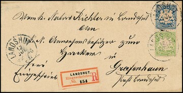 3 Pfg. grün und 20 Pfg. blau auf seltenem Einschreibebrief von Landshut in den eigenen Landbezirk nach Grafenhaun mit Aufbrauchs-R-Zettel mit zusätzlich eingestempeltem rotem "R", sign. Helbig