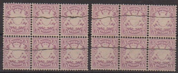 5 Pfg. purpur, zwei Sechserblöcke je mit handschriftlicher Entwertung