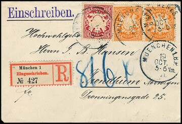 Drei Briefe aus einer Korrespondenz 1884-1901 nach Trondheim/Norwegen: Drucksache mit 5 Pfg. lila, Brief (Öffnungsmgl.) mit zweimal 20 Pfg., sowie entzückendes R-Couvert mit 10 Pfg. rosa und Paar 25 Pfg. orange (selten, 2. Gewichtsstufe)
