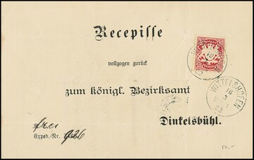10 Pfg. (einmal kl. Zf.) je einzeln auf drei vorgedruckten "Recepissen" 1902 aus Wittelshofen und Gerofingen (2) nach Dinkelsbühl