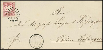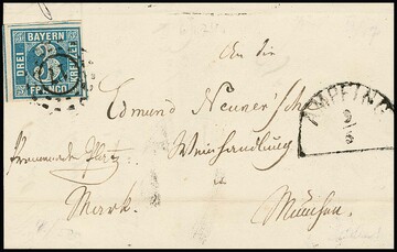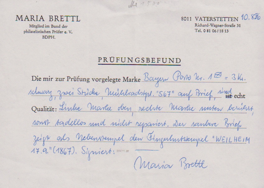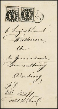 Portomarke 3 Kr. schwarz, zwei einseitig (einmal nur minimal) berührte Exemplare als gute Mehrfach-Frankatur auf Brief mit gMR "567" und besserem Fingerhut-K1 "Weilheim" aus 1867. Mehrfach-Frankaturen dieser Marke sind selten (Michel nur für Federzug schon 1700,-), sign. mit Fotoexp. Brettl