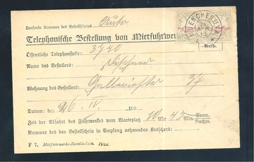 Portomarke 5 Pfg. im Paar in ungewöhnlicher Verwendung auf Postformular (übl. Gebrauchsspuren), "Telephonische Bestellung von Mietfuhrwerken" aus München