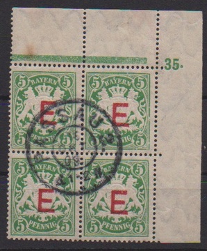 5 ("35") sowie 10 u. 20 Pfg. ("36") je in zentrisch gestempelten Eckrand-Viererblöcken mit Plattennummer. Mi. 160,-
