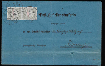 Portomarken 10 Pfg. je per zwei auf drei Orts-Zustellurkunden, aus Uffenheim 1881, Ansbach 1892 und Rothenburg/T. 1895