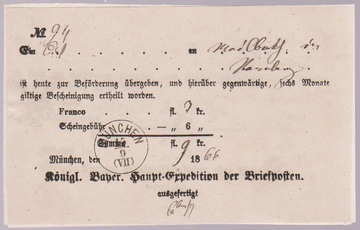 "München", 1866/68, zwei Postscheine, einer mit rotem Stempel "München Charge"