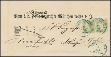 "München-Au", besserer blauer K1 klar auf Orts-Doppelbrief mit Paar 1 Kr. grün (Gerichtsvordruck, sign. Pfenninger), dito auf Briefstück mit Paar 1 Kr.