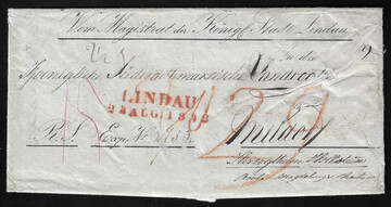 "Lindau", 1842, roter L2 auf ungewöhnlich frühem Brief (Gebrauchsspuren) nach Meldorf/Herzogthum Holstein, Taxe "29" Sk.