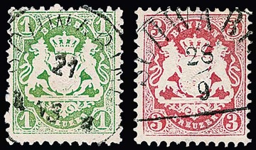"Prien", K1 in blau bzw. schwarz auf zwei Briefen 7 Kr. blau (beide Wz., Nr. 25Xa sign. Schmitt), sowie auf Brief 3 Kr.
