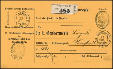 "Regensburg", 1889, K1 klar auf dekor. beiger Paketkarte mit Vordruck der Gendarmerie-Kompanie portofrei nach Stuttgart