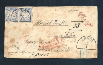 "Zandt", besserer HK klar auf fleckiger Chargébrief-Vs. mit zweimal 7 Kr. blau nach Indiana/USA