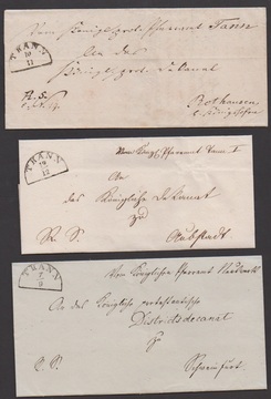 "Tann" a.d. Rhön, (1836/38) und 1851, HK des später an Preußen abgetretenen Postortes auf drei Briefen, einer mit Inhalt