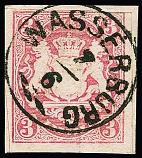 "Wasserburg", kleiner Zier-K1 klar auf Briefstück 3 Kr. rosa (re. oben Randlinienschnitt), sowie als Nebenstempel auf Mühlradstempel-Brief (oMR "560") mit perfekter 3 Kr. rosa