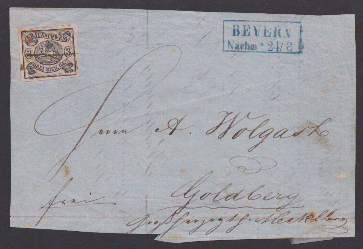 "3" nebst Ra2 "Bevern" auf Prachtbrief 2 Sgr. (mit hs. Landbestellgeld)