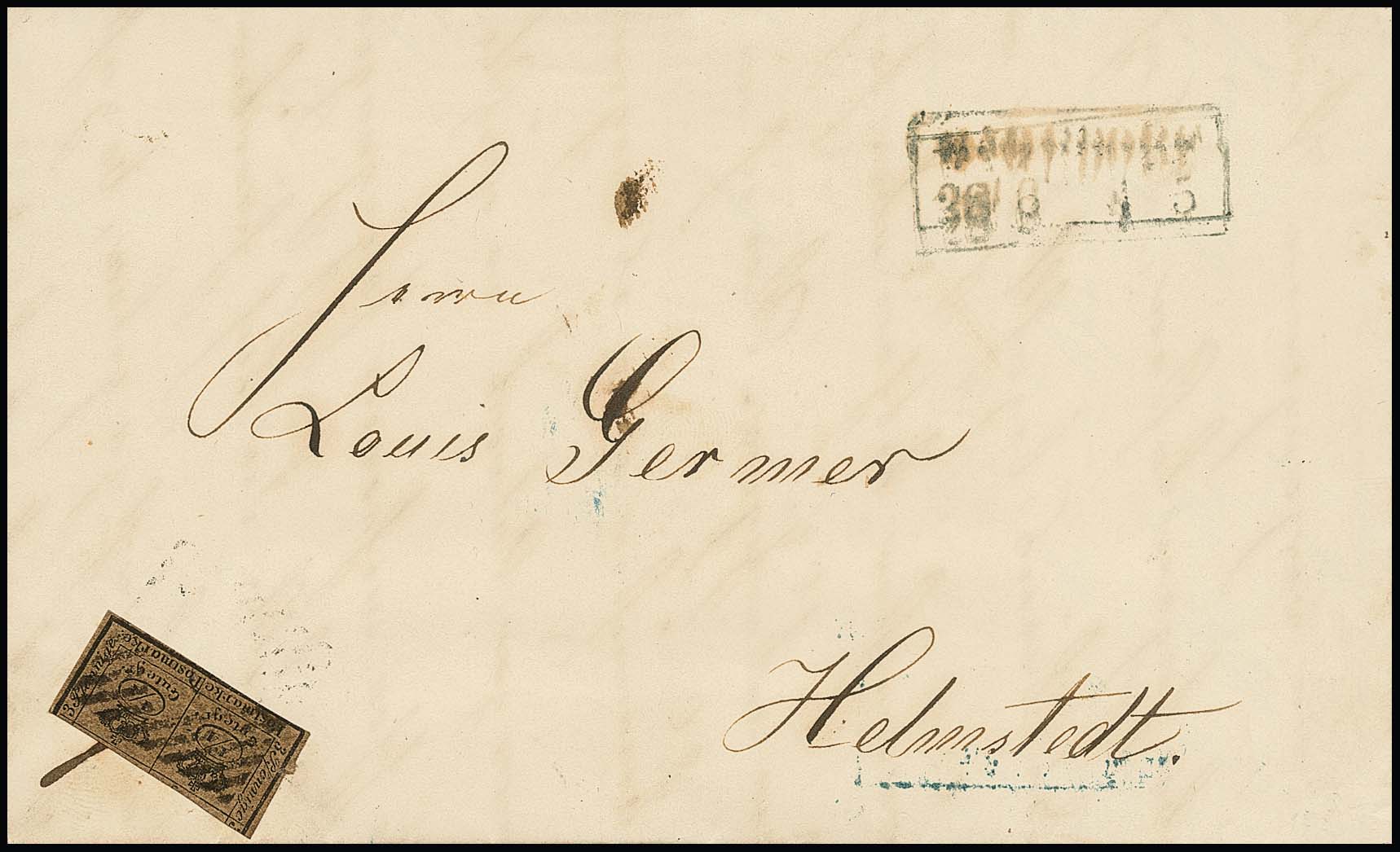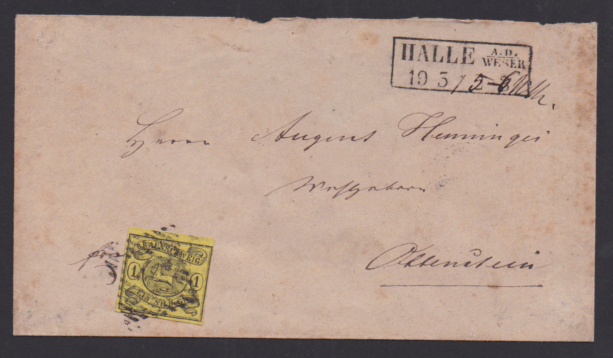 "18" nebst Ra2 "Halle a.d. Weser" mit hs. geänderter Uhrzeit auf Couvert (rechts leicht randfleckig und rs. fehlt die obere Klappe teilweise) mit Prachtstück 1 Sgr.