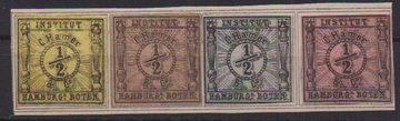 1861, Private Stadtpost "C. Harmer + Co.", vier ungebrauchte Werte zu 1/2 Sch. schw./gelb, a. braun, grau und violettrosa, zusammen auf Unterlage, dazu zwei spätere Neudrucke