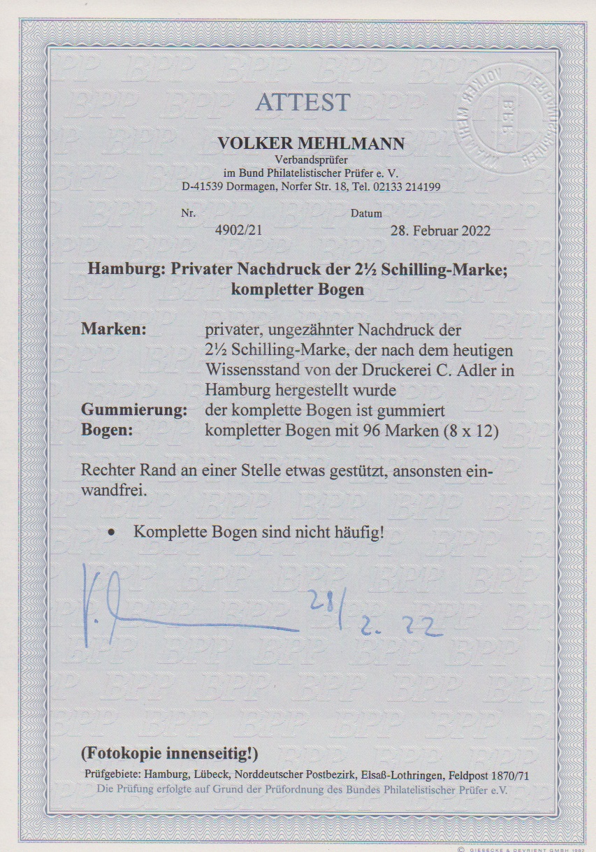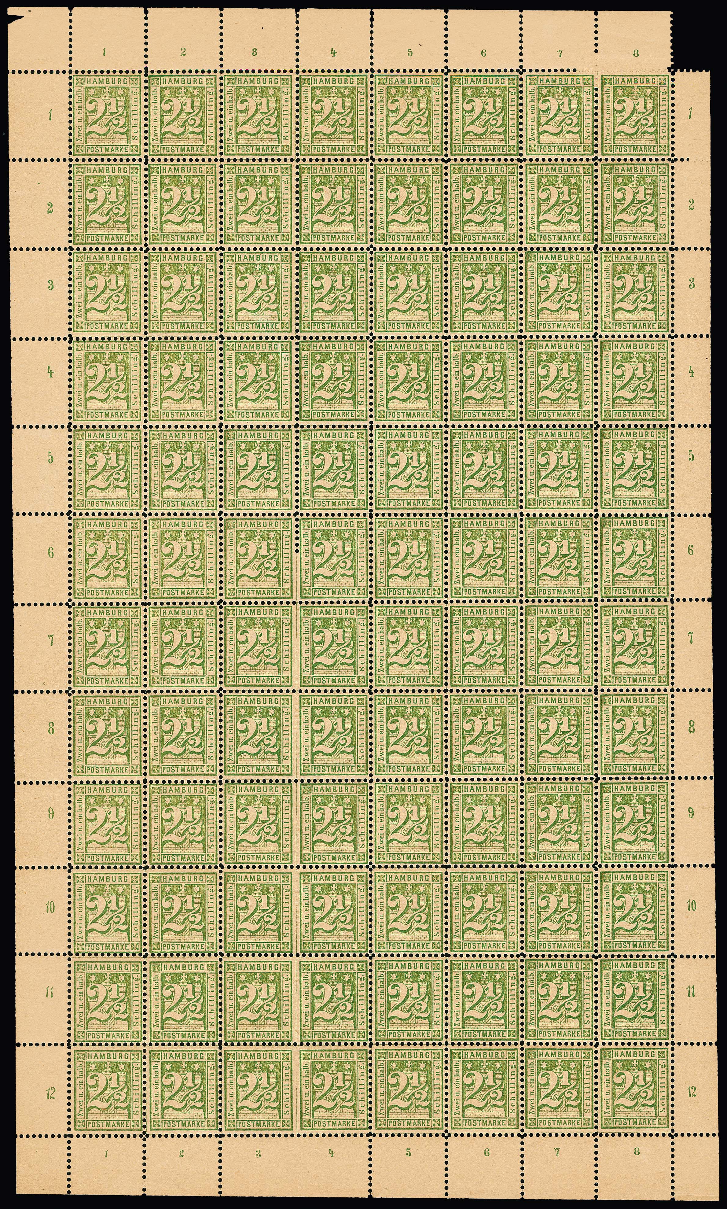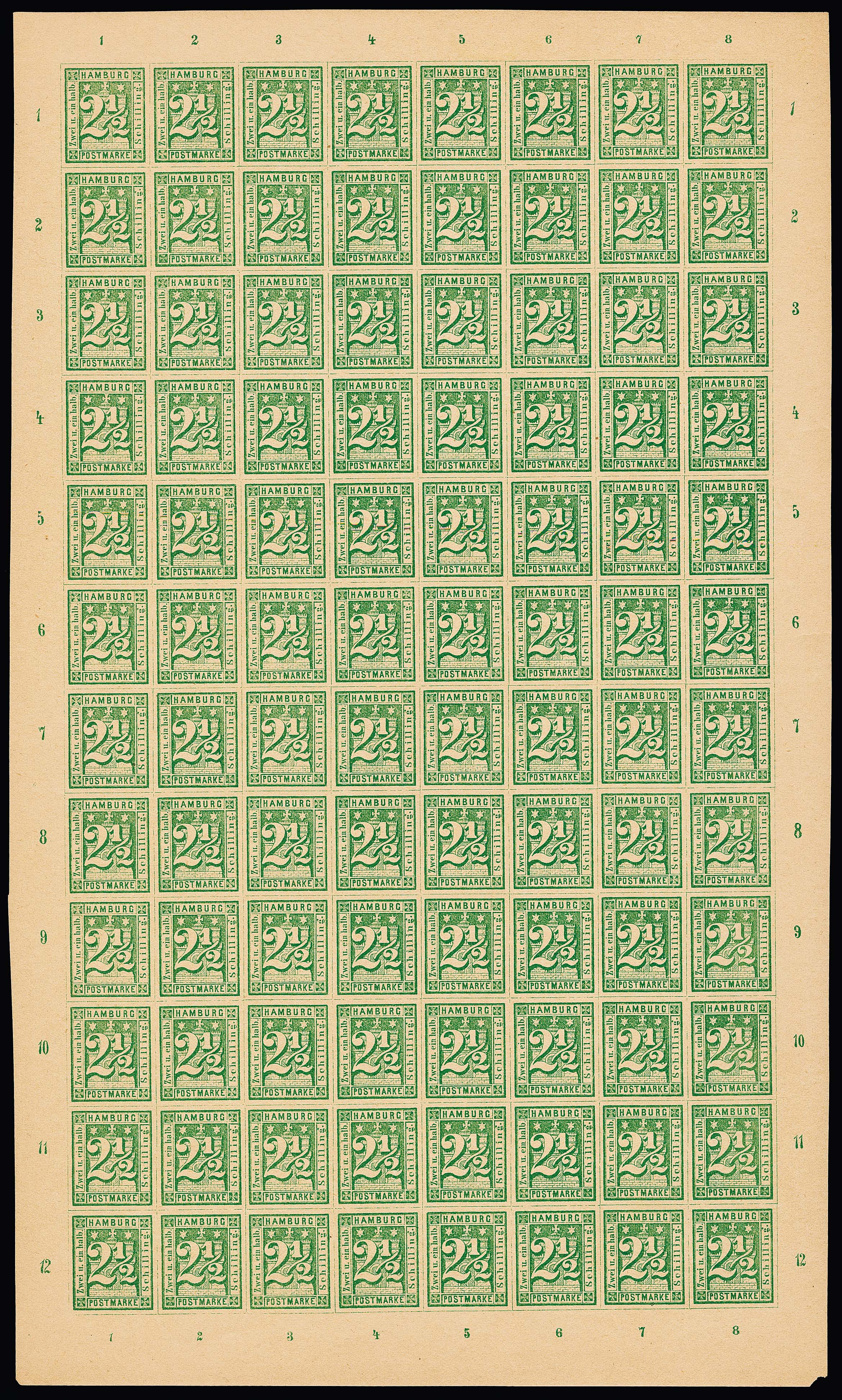 2 1/2 Sch. hellgrün, geschnitten, Nachdruck der Druckerei C. Adler im vollständigen Bogen von 96 Exemplaren mit allen Rändern und Bogenzählnummern, in für einen solchen Bogen überdurchschnittlicher Erhaltung (nur am rechten Rand etwas gestützt). Attest Mehlmann