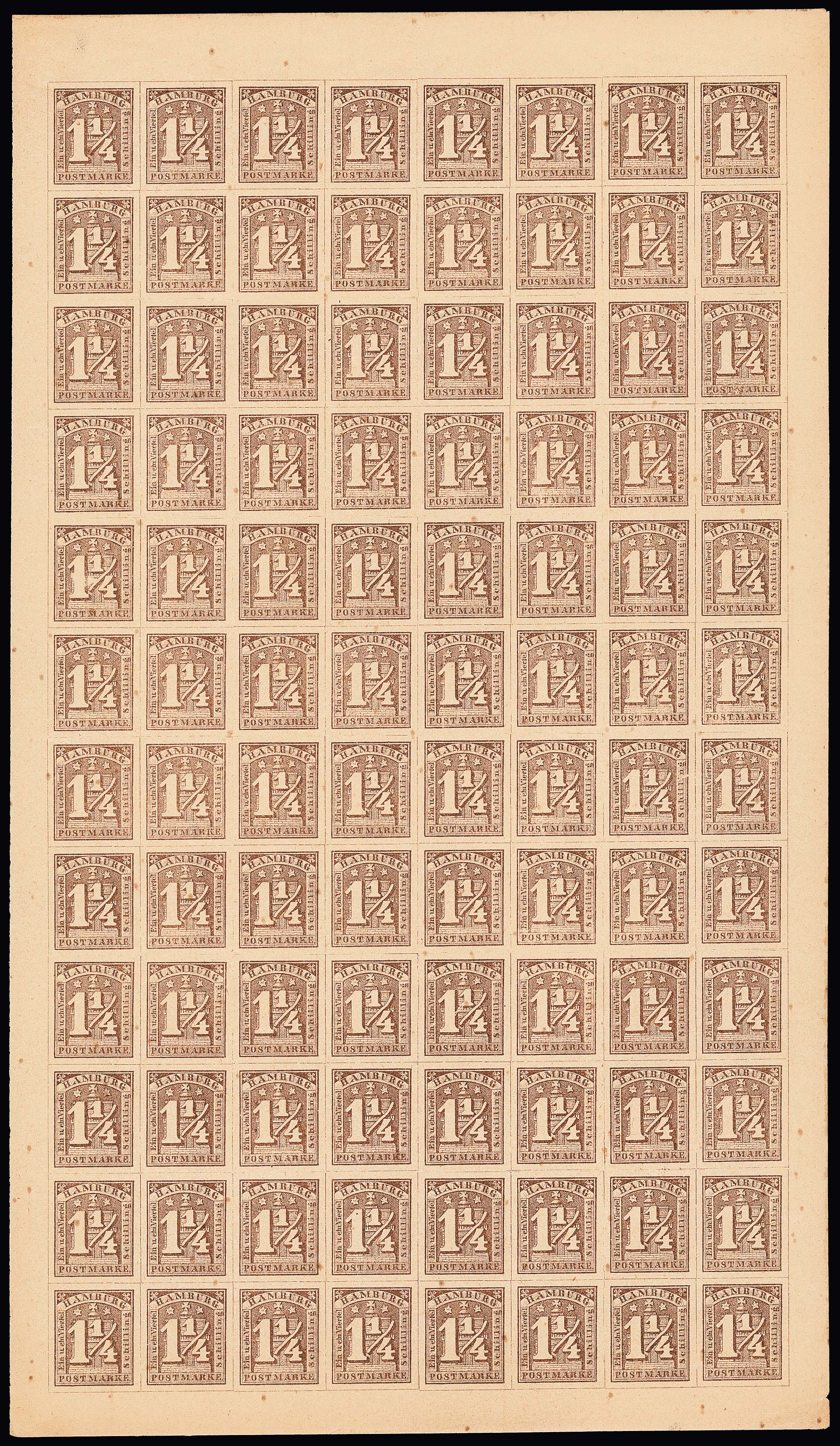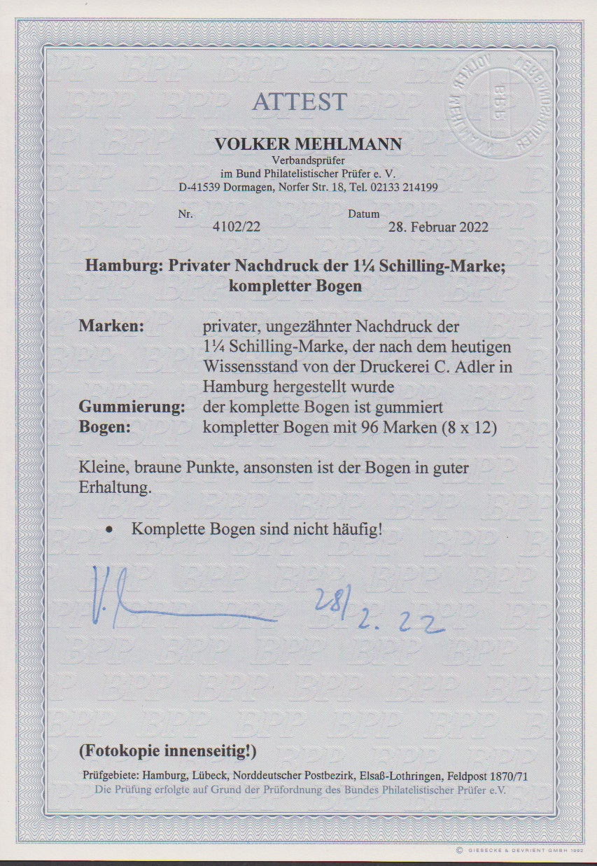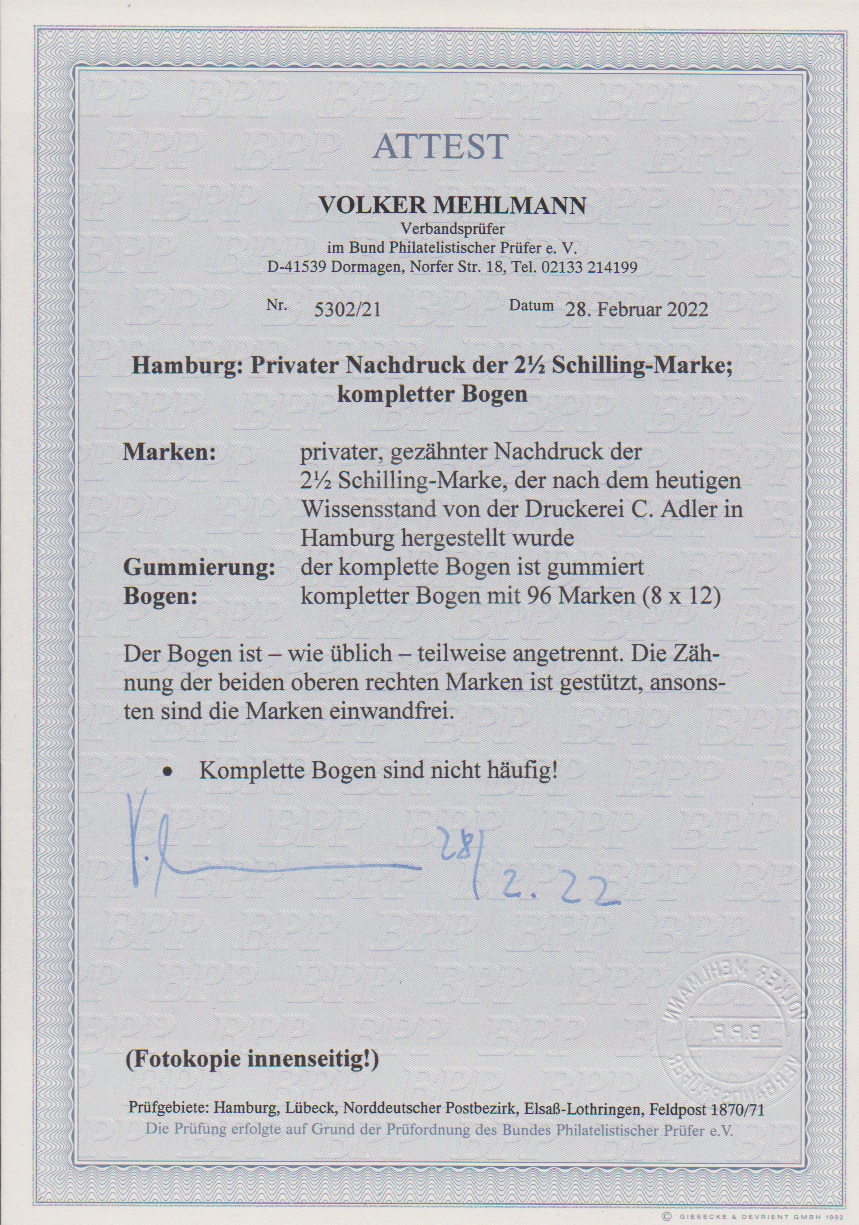 2 1/2 Sch. hellgrün, geschnitten, Nachdruck der Druckerei C. Adler im vollständigen Bogen von 96 Exemplaren mit allen Rändern und Bogenzählnummern, in für einen solchen Bogen überdurchschnittlicher Erhaltung (nur am rechten Rand etwas gestützt). Attest Mehlmann