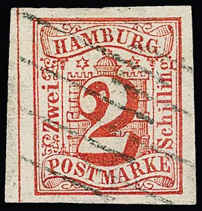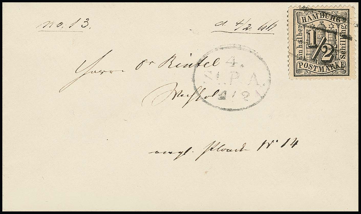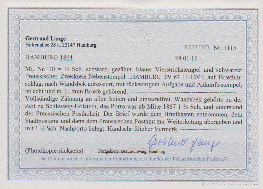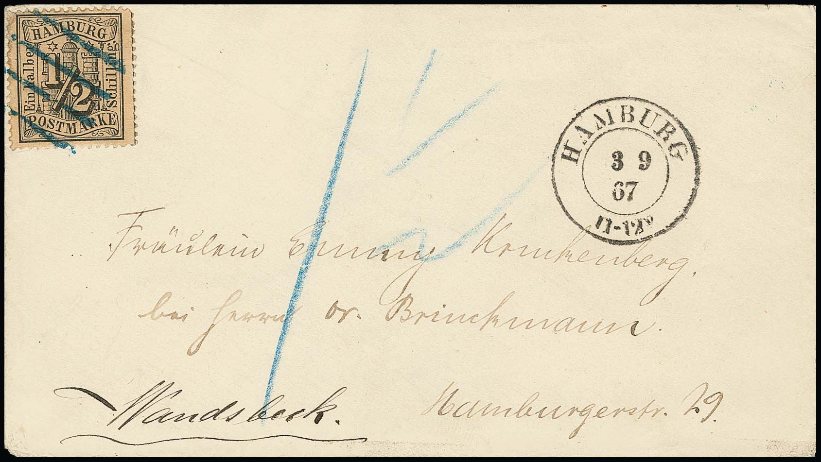 1/2 Sch. schwarz einzeln auf Prachtcouvert 1867 nach Wandsbek, blauer Balkenstempel und preußischer K2, Wandsbek gehörte zu dieser Zeit zu Schleswig-Holstein, so dass der Brief dem preuss. Postamt zur Weiterbeförderung übergeben und 1 1/2 Sch. Nachporto erhoben wurde. Durch Randklebung ein gering verkürzter Zahn, lt. Fotoexp. Lange "vollständige Zähnung an allen Seiten und einwandfrei". Interessanter unterfrankierter Brief