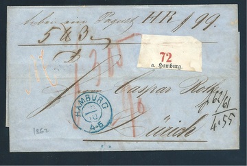 "Hamburg", 1862, blauer K2 des hannöv. Postamtes auf Paketbegleitbrief (nebst Paketzettel) nach Zürich/Schweiz