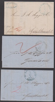"Hamburg", 1862-1864, großer blauer bzw. schwarzer K1 "St.P.A. Bahnhofs-Exped. Hamburg" auf drei Briefen je nach Geesthacht (rs. schwarzer K2 und HK "Bergedorf")