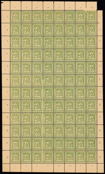 2 1/2 Sch. grün, gezähnt, Nachdruck der Druckerei C. Adler im vollständigen Bogen von 96 Exemplaren mit allen Rändern und Bogenzählnummern, in für einen solchen Bogen überdurchschnittlicher Erhaltung (leicht angetrennt und zwei Marken in der Zähnung gestützt). Attest Mehlmann
