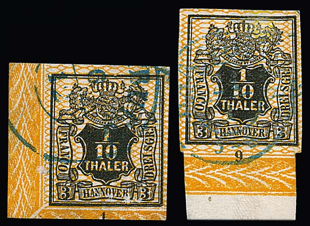 1/10 Th. schw./orange, linke untere Bogenecke mit Teil der Reihenzahl "1", sowie großes Bordüren-Unterrandstück mit Reihenzahl "9", kl. Mgl.