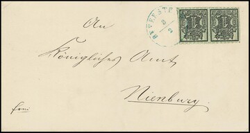 1 Gr. schw./grün einzeln breitrandig auf Kabinettbrief mit Ra2 "Melle", sowie im Paar auf Kabinettbrief mit K2 "Beverstedt", dabei linke Marke kurios unentwertet