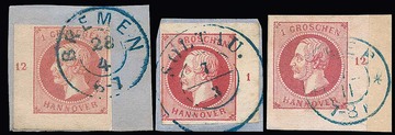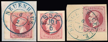 1 Gr. rosa, drei linke untere Bogenecken je auf klar gestempelten Briefstücken, einmal mit Plattenfehler "1 mit weißem Fleck oben" (Kabinettbriefstück mit Ra2 "Esens")