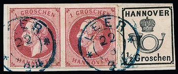 1 Gr. rosa auf Kabinettbrief mit schwarzem L1 "Zeven" (wahrscheinlich Vorausentwertung), blauer K2 nebengesetzt