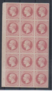 1 Gr. rosa, 15er-Block aus der linken oberen Bogenecke mit Reihenzahlen "1" bis "5", obere Reihe ungebraucht (kl. Gummimgl.), der untere 12er-Block postfrisch (lose Marken 180,- Mi. ++)