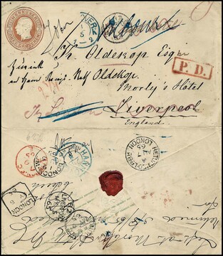 Ganzsache 3 Gr. braun von Hannover 1860 nach Liverpool/England und von dort nach drei Monaten mit zahlreichen Vermerken und Stempeln wieder retour, da abgereist. Eine Marke auf dem Postwege abgefallen, zur Präsentation geöffnet und auf Unterlage geklebt