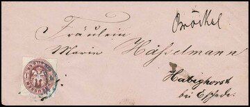 "Bröckel", hs. Briefsammlungsaufgabe, Marke mit K2 "Celle" entwertet, auf rosa Damencouvert (Gebrauchserhaltung) mit Preußen 1 Sgr., aus der Preußenzeit bisher einzig bekannter Briefsammlungsbrief