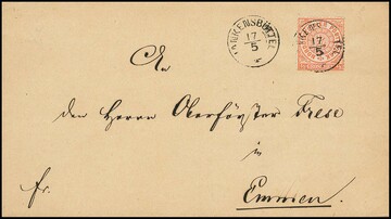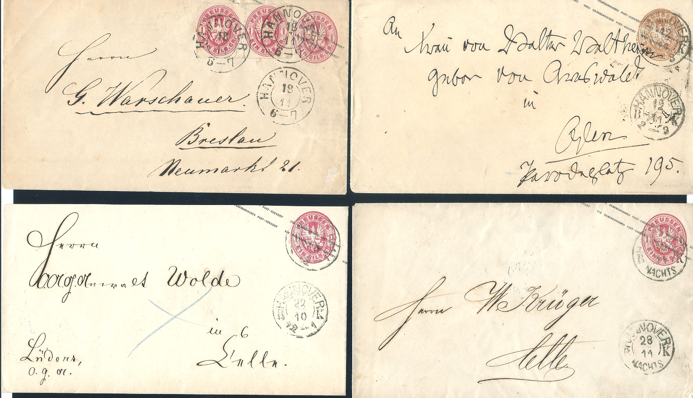 "Hannover" bzw. "Hannover B.K.", je nachverw. schwarze K2 (erst im letzten Quartal `67 verwandt) auf vier Preußen-Ganzsachen, teils mit ZuF