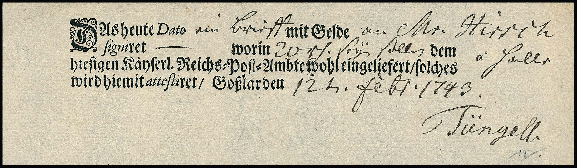 "Goslar", 1743, "hiesigen Kayserl. Reichs-Post-Amte", seltener Ortsdruck-Postschein