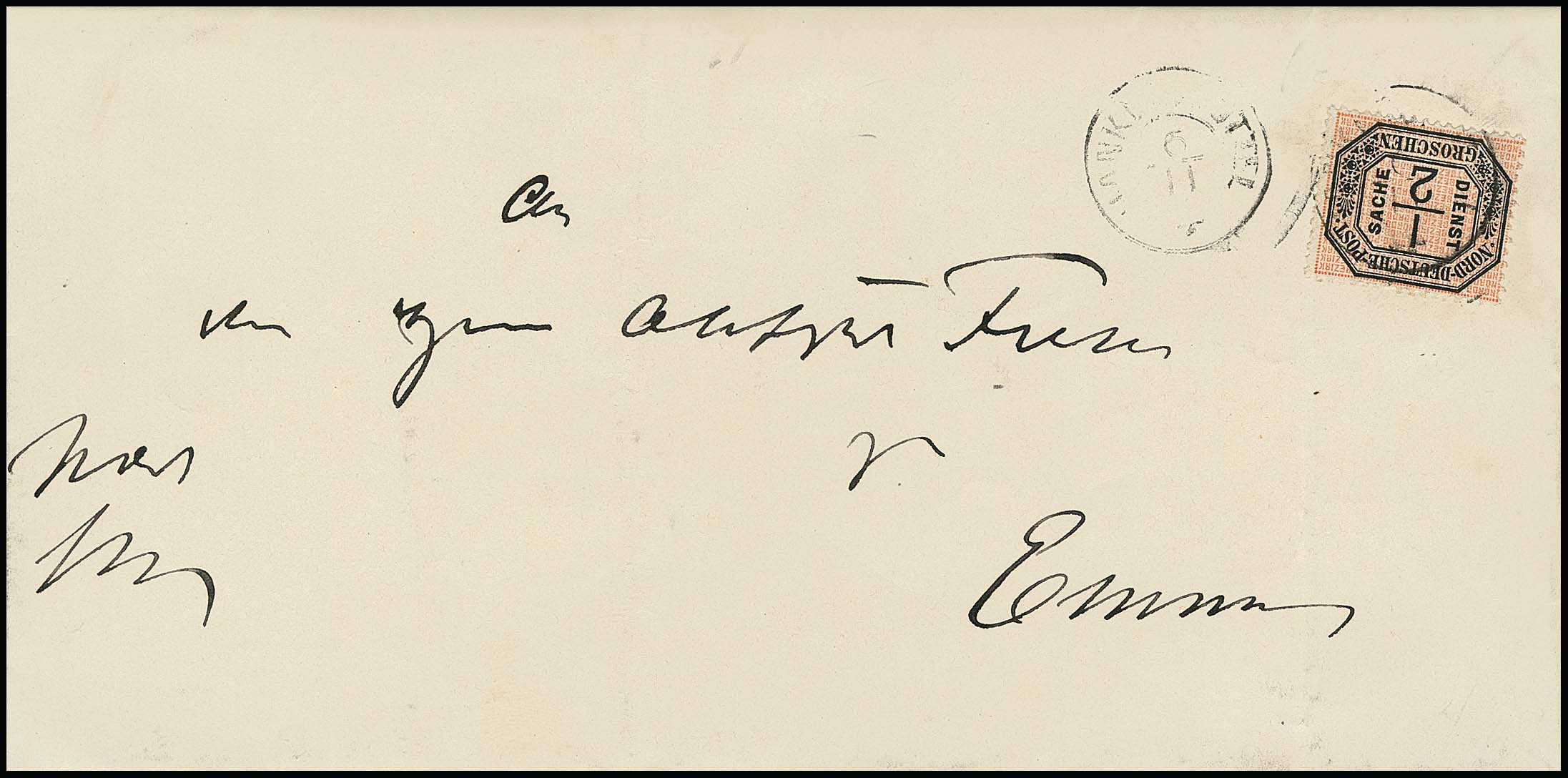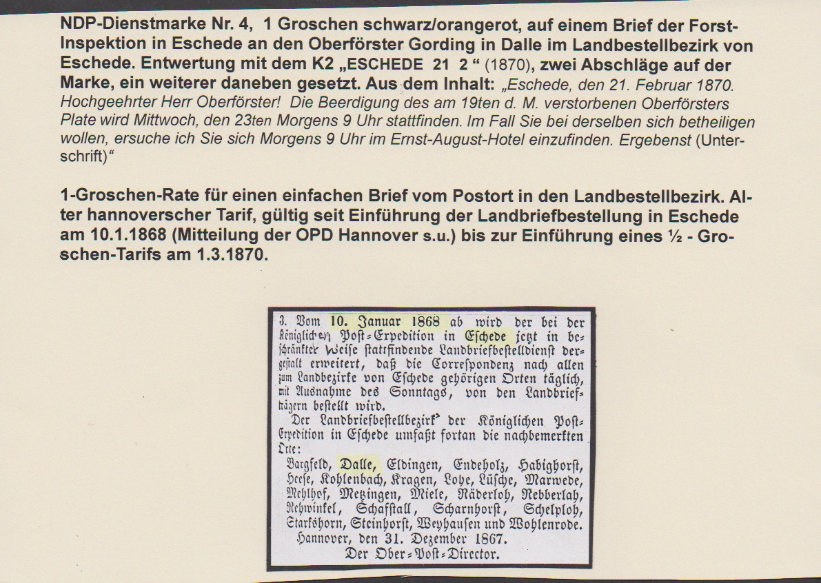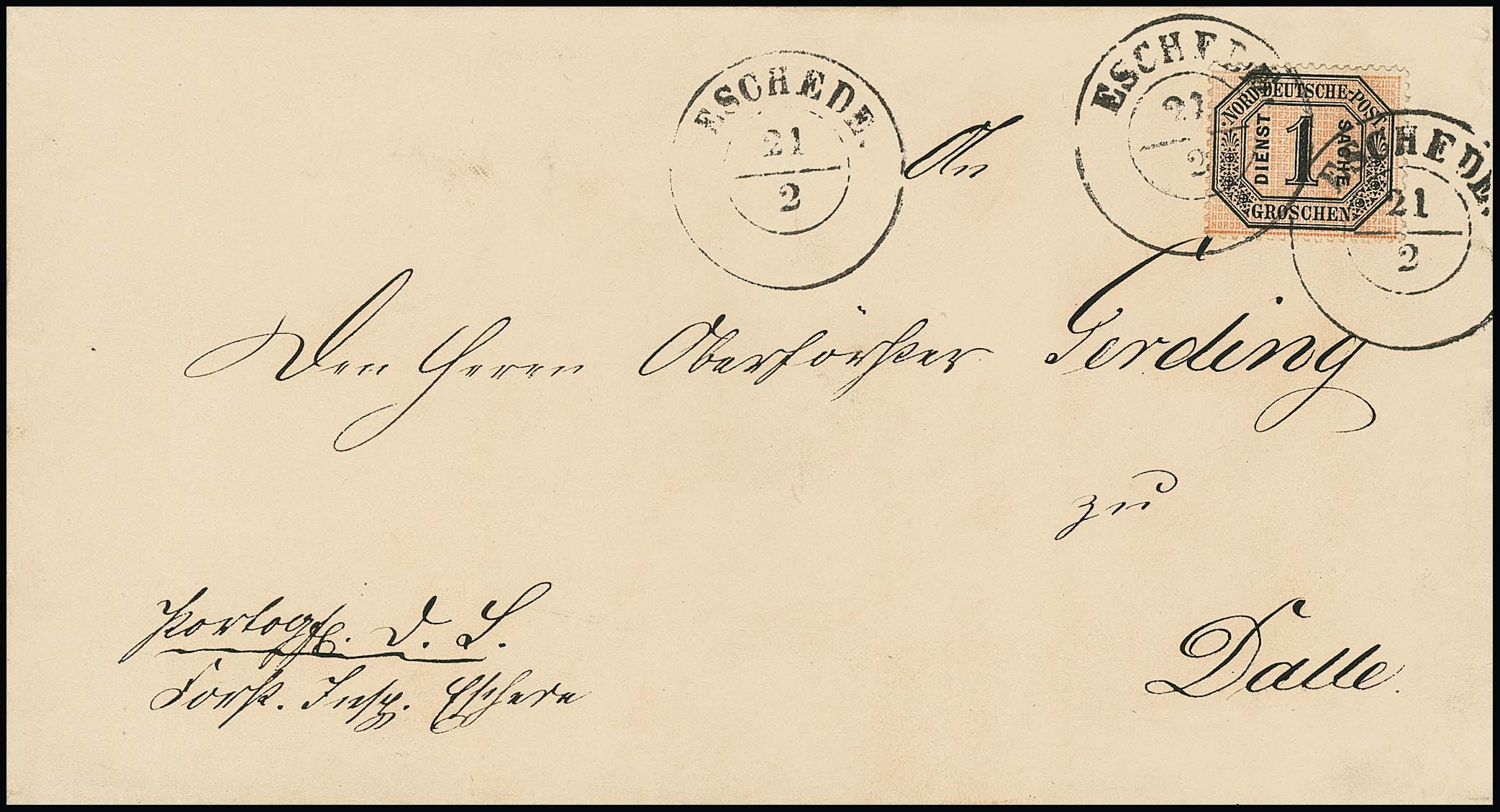 "Eschede", nachverwendeter K2 auf Kabinettbrief mit Einzelfrankatur Dienst 1 Gr. nach Dalle in den eigenen Landbezirk. Seltener Brief nach Einführung der Landbriefbestellung (10.1.69) und vor Portoermäßigung auf 1/2 Gr. (1.3.70)