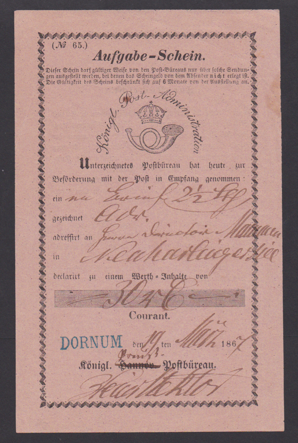 "Dornum", 1867 (19.3.), blauer L1 auf Postschein, Vordruck "Hannov." hs. in "Preuß." geändert