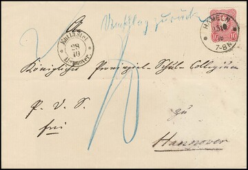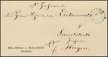 "Hannover", (1866), blauer K2 auf portofreiem Vordruckbrief der "Milit.-Wittwen- u. Waisen-Unterst.-Gesellschaft", hs. "0 fr.", nach Hagen