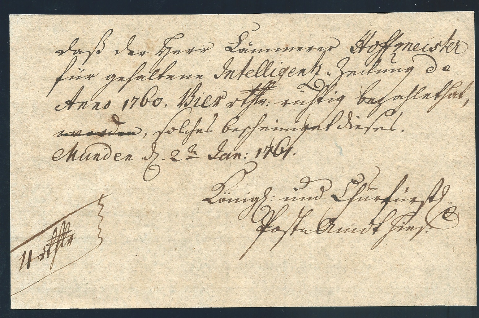 "Münden", 1761, früher handschriftlicher Zeitungsschein "königl. und churfürstl. Postambd"