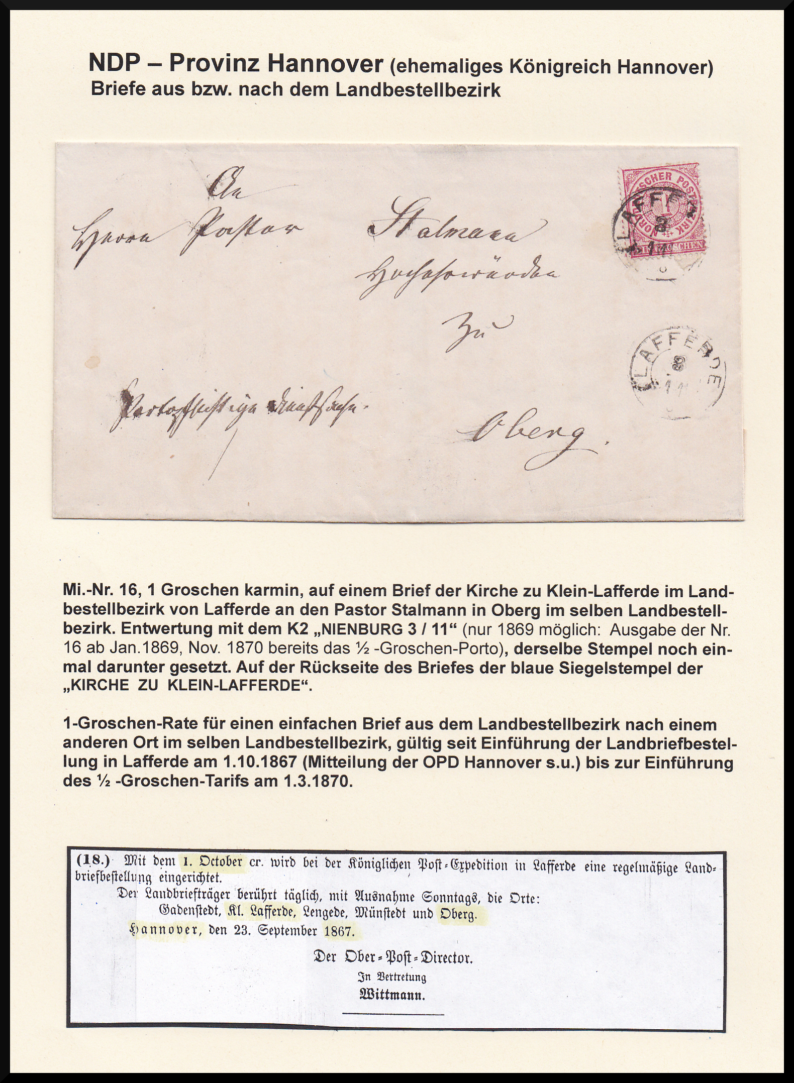 "Lafferde", nachverw. K2 auf Brief mit Einzelfrankatur NDP 1 Gr., innerhalb des eigenen Landbezirks nach Oberg gelaufen (Porto nur kurz bis zur Ermäßigung auf 1/2 Gr. zum 1.3.70 möglich). Absender die Kirche zu Klein-Lafferde