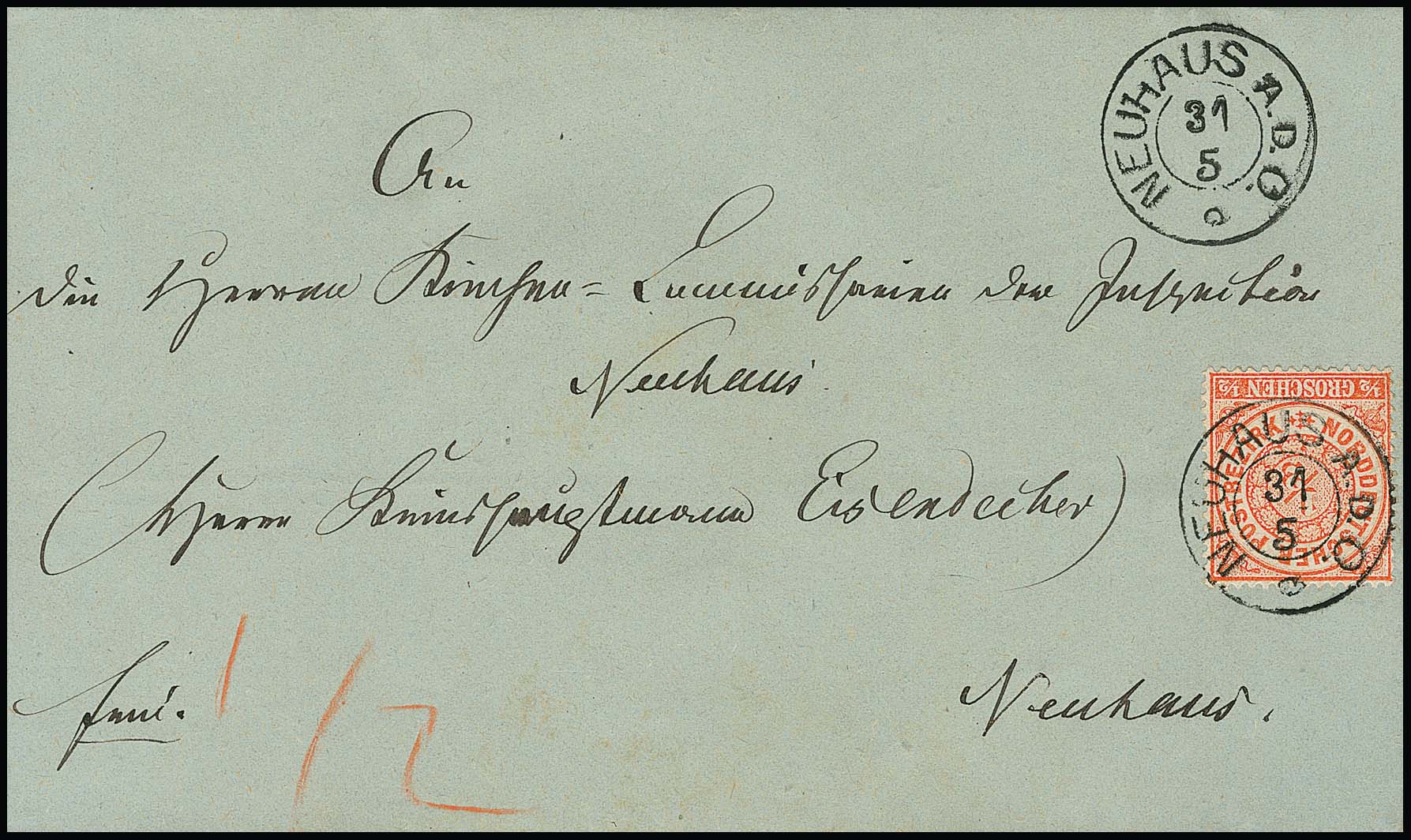 "Neuhaus a.d.O.", nachverw. K2 klar auf Kabinettbrief mit Einzelfrankatur NDP 1/2 Gr. orange im Ortsbereich, aus dem eigenen Landbezirk aus Bülkau stammend (rs. Gemeindesiegel)