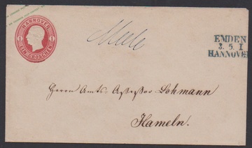 "Melle", hs. Bahnpost-Aufgabe und Zug-L3 "Emden-Hannover" auf Kabinett-Ganzsache 1 Gr.