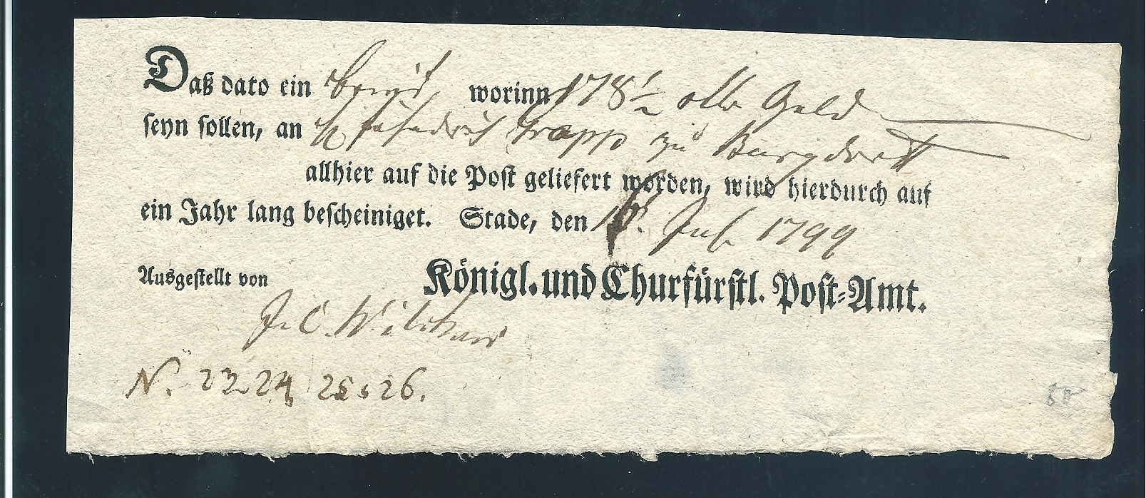 "Stade", 1799, Ortsdruck-Postschein, "königl. und churfürstl. Post-Amt"