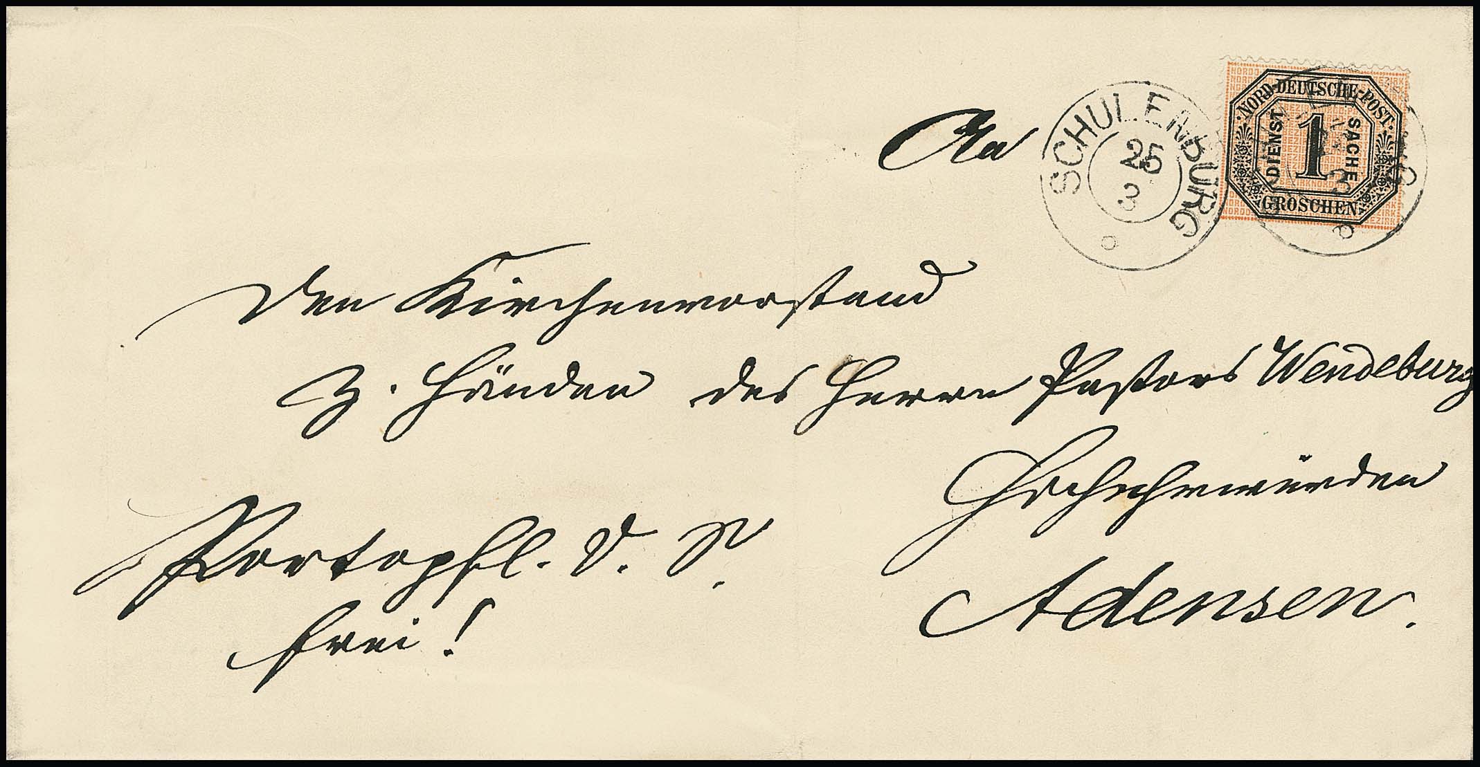 "Schulenburg", nachverw. K2 auf Brief mit Kabinettstück NDP Dienst 1 Gr. in den eigenen Landbezirk nach Adensen (frühere Briefsammlung), 25.3.70, also nach Portoermäßigung zum 1.3.70, offensichtlich war die Portoermäßigung noch nicht bekannt