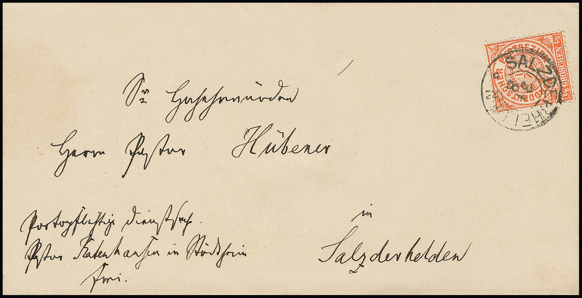 "Salzderhelden", nachverw. K2 auf Kabinettbrief mit Einzelfrankatur NDP 1/2 Gr. orange, aus dem eigenen Landbezirk aus Stöckheim stammend als Ortsbereichsbrief