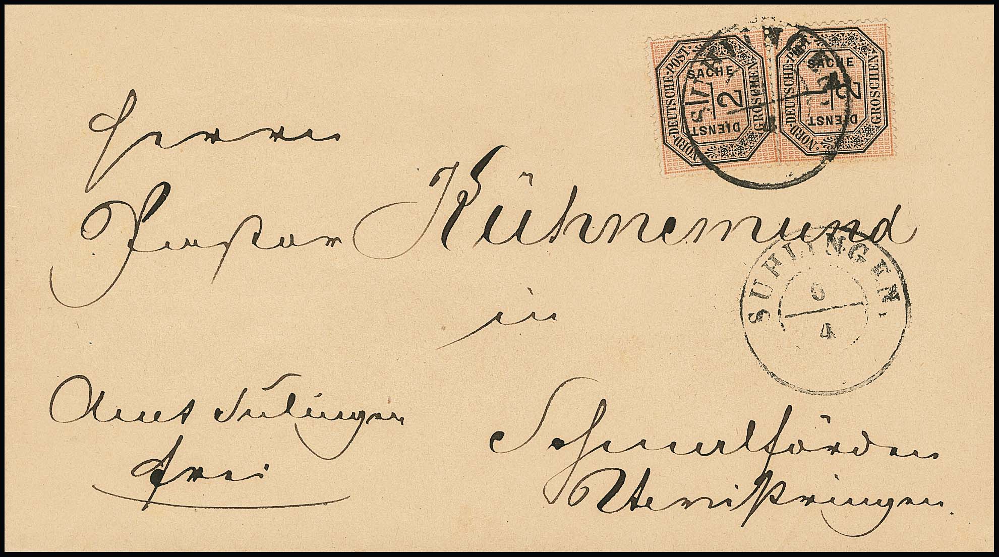 "Suhlingen", nachverwendeter K2 auf zwei Briefen in den eigenen Landbezirk, nach Schwafördern mit zweimal NDP Dienst 1/2 Gr. noch vor Portoermäßigung (zum 1.3.70, selten!), sowie mit Einzelfrankatur Dienst 1/2 Gr. nach Scholen