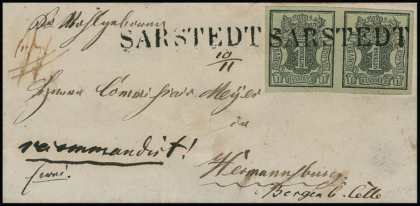 "Sarstedt", schwarzer L1 auf kleinem Einschreibebriefchen mit breitrandigem Paar 1 Ggr. schw./graugrün (linke Marke unauffälliges Aufklebefältchen)