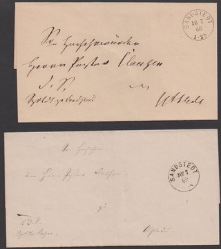 "Sandstedt", 1868/69, besserer neuer NDP-K1 klar auf zwei Briefen je nach Uthlede, Landbezirk von Hagen