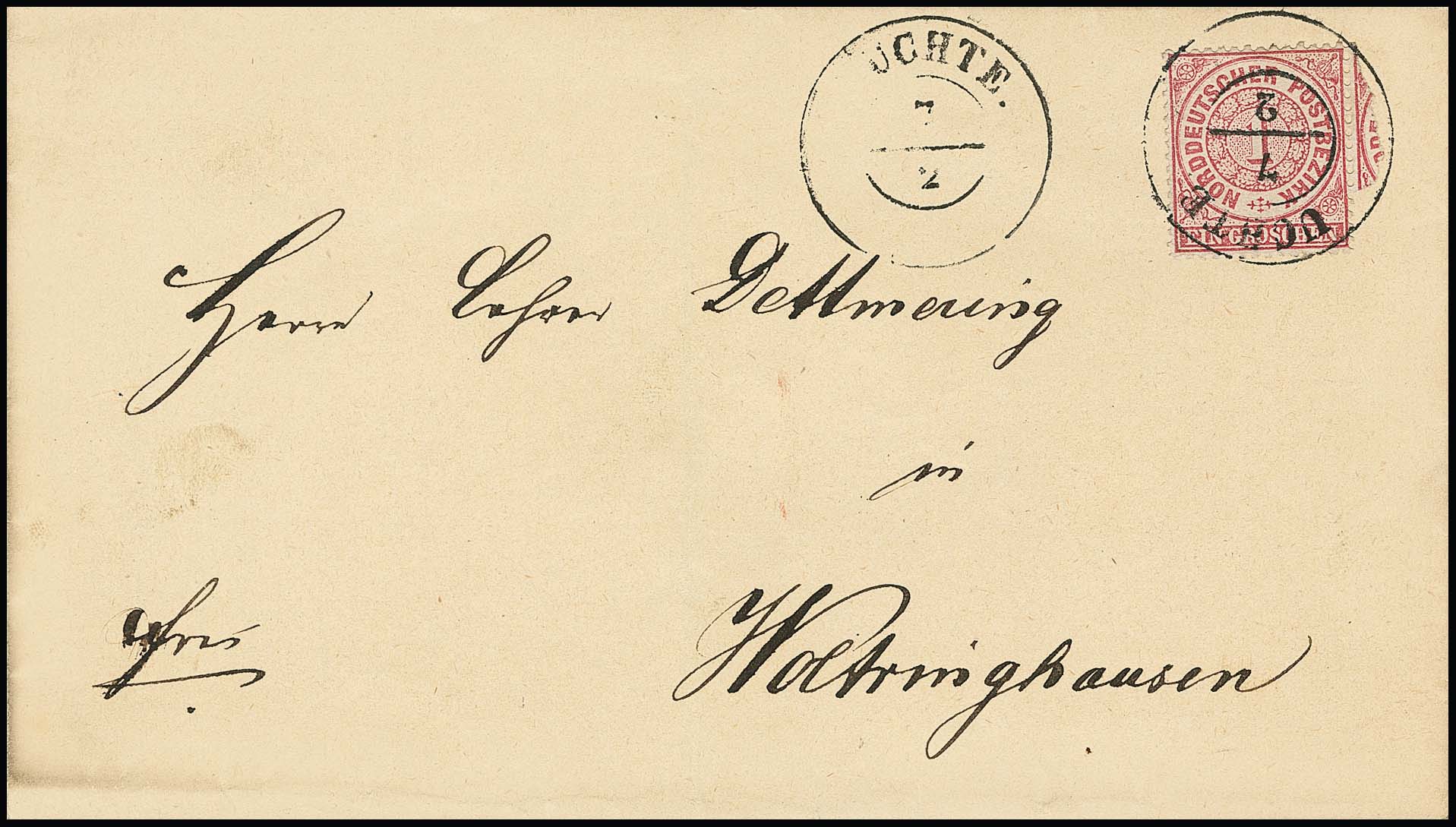 "Uchte", nachverw. K2 auf Kabinettbrief mit 1 Gr. NDP in den eigenen Landbezirk nach Woltringhausen. Seltener Brief vor Portoermäßigung auf 1/2 Gr. für Briefe in den eigenen Landbezirk (zum 1.3.70)