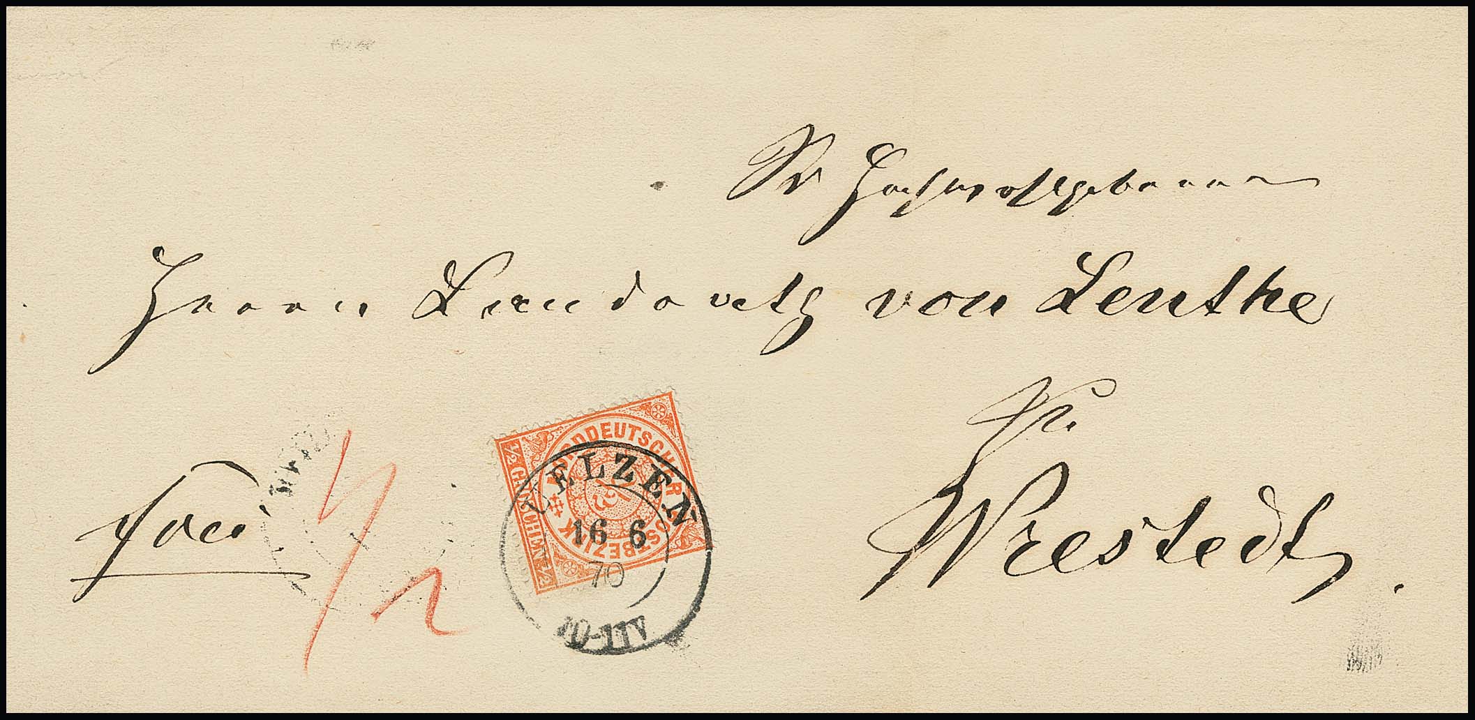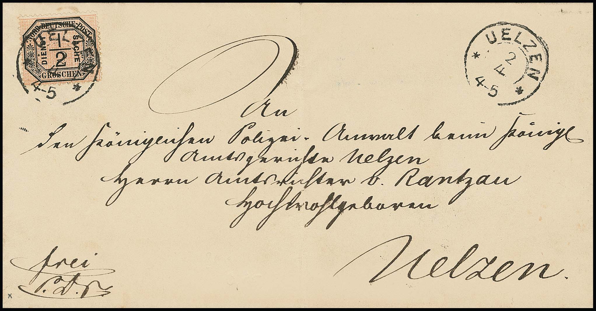 "Uelzen", nachverwendeter bzw. neuer K2 auf zwei Briefen aus bzw. in den eigenen Landbezirk, mit Einzelfrankaturen NDP 1/2 Gr. orange nach Wrestedt (an von Lenthe), sowie mit Dienst 1/2 Gr. aus Oldenstadt